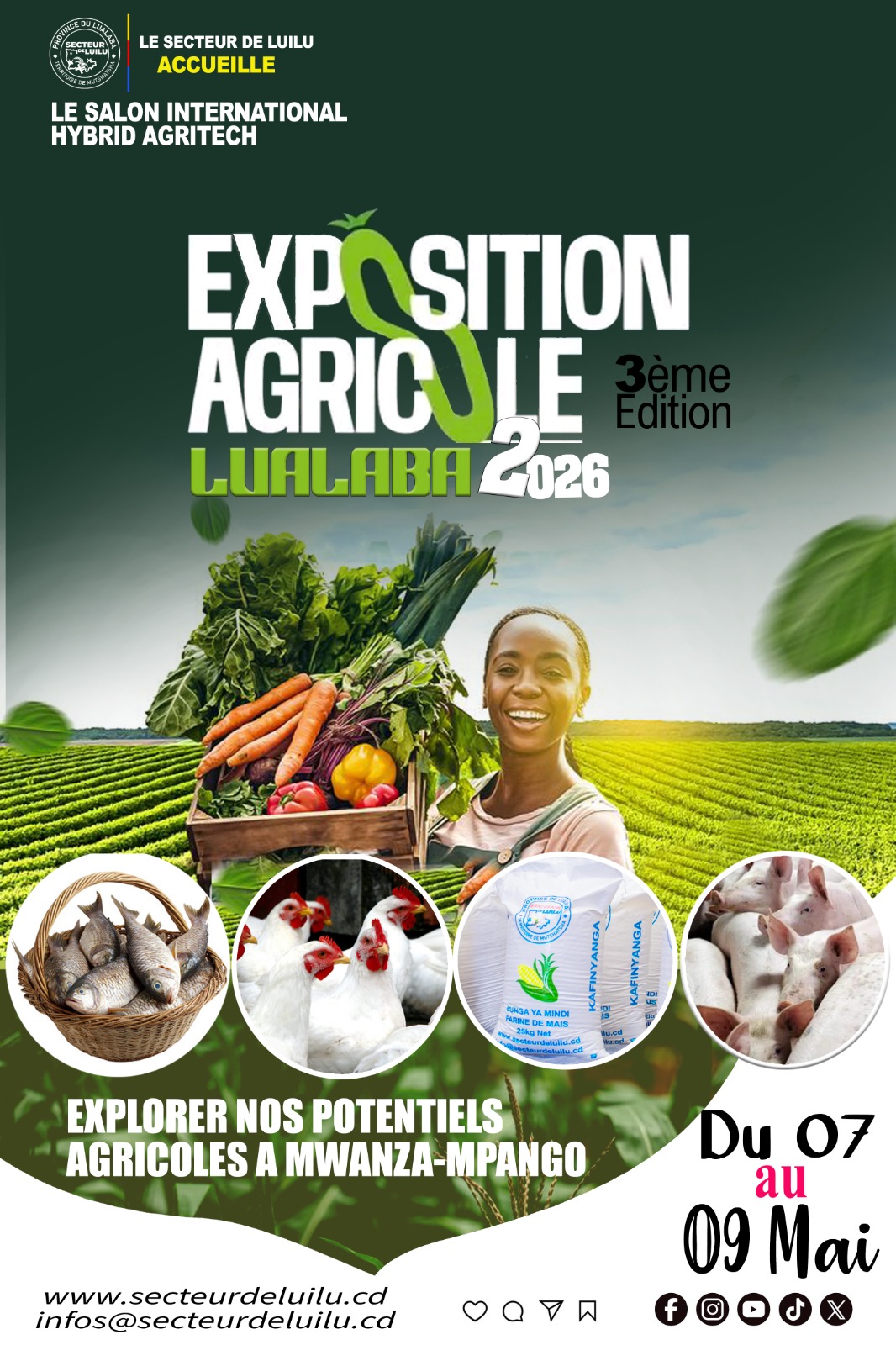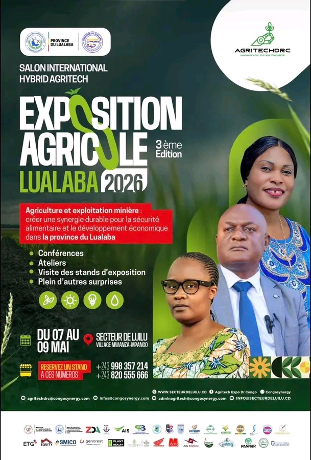 Du 07 au 09 mai, le Secteur de Luilu vibrera au rythme de la troisième édition de l’exposition agricole, sous le thème « Agriculture et exploitation minière : créer une synergie durable pour la sécurité alimentaire et le développement économique dans la Province du Lualaba.» Cet évènement riche en couleur organisé en collaboration avec le Salon International Hybrid Agritech, se tiendra au village Mwanza-mpango, situé dans groupement Mwanfwe, Territoire de Mutshatsha.